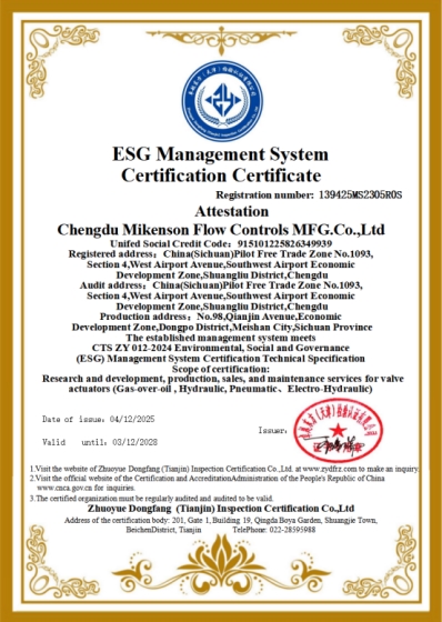 在产品层面,迈可森核心的气液联动执行机构,利用管道自身压力驱动,无需外接电源,从源头上实现了能源的低碳、高效利用,广泛应用于石油、天然气等长输管线的安全守护,其“零外能”设计理念与节能减排的全球目标高度契合。此次ESG认证,正是对其产品环境友好属性的系统化肯定。