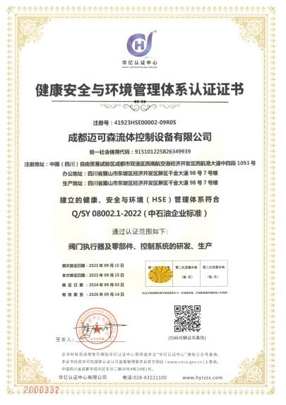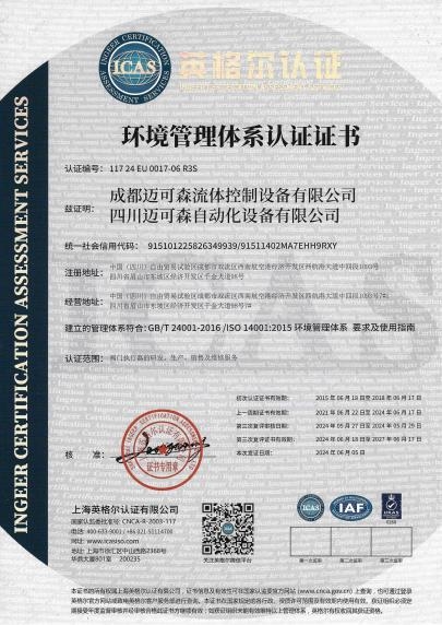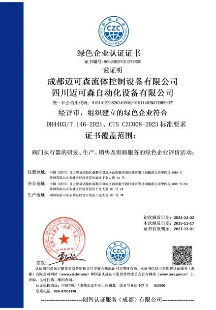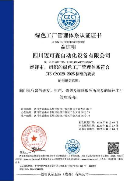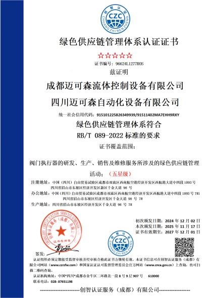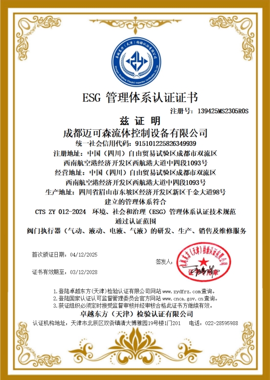 近日,成都迈可森流体控制设备有限公司正式获得 ESG管理体系认证证书,标志着迈可森在环境(Environment)、社会(Social)与治理(Governance)三大维度的系统性建设与可持续发展实践获得了权威认可,也是对其“与中国绿色能源共同进步”企业初心的有力印证。